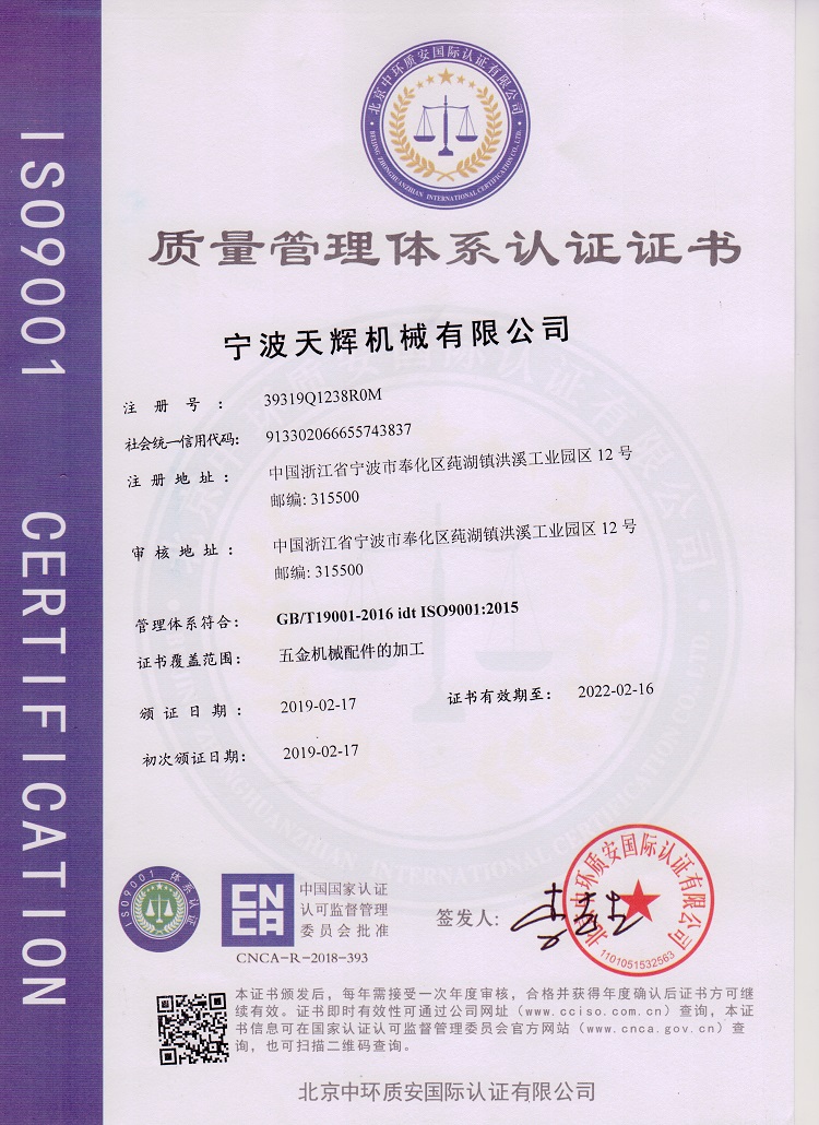 天辉通过了ISO9001:2015 质量管理体系认证。公司内的进料流程、生产流程、生产工艺、出货流程等精密铸造加工都是按照ISO9001质量标准执行,严格的控制产品质量。在满足质量的前提下,达到快速交货,让客户满意。